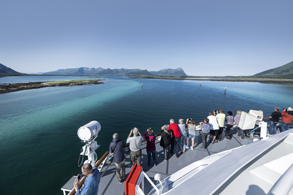 informatie over de reis en de plaatsen waar je langskomt, over Noorse cultuur en de Noorse geschiedenis. In de winkel kun je terecht voor kleding, boeken en lokale specialiteiten. En als via de luidsprekerinstallatie bijzonderheden en hoogtepunten de kust worden aangekondigd, kun je buiten op de boeg terecht voor het allerbeste uitzicht. Soms zijn er ook activiteiten die te maken hebben met de plaatsen waar je langs vaart, zoals het passeren van de poolcirkel waar je het Arctische gebied in vaart; het land met de lichte zomernachten en donkere winterdagen.