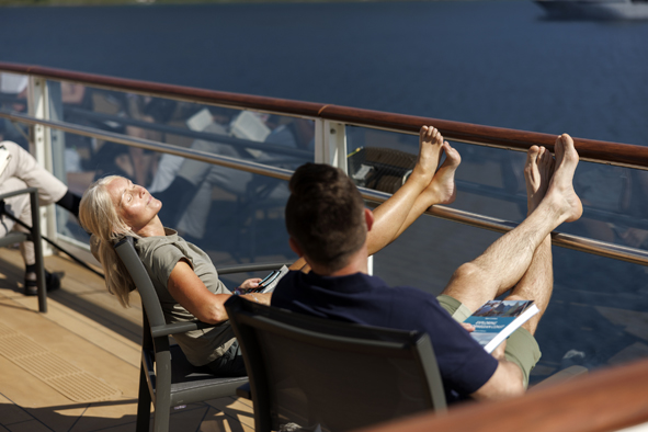de observation lounge op het negende dek. Daar vind je ligstoelen onder het glazen dak, een plek waar je rechtstreeks uitzicht hebt op het noorderlicht, de nachtelijke sterrenhemel of een lucht waar je 's zomers de kleuren van de middernachtzon in terug ziet.