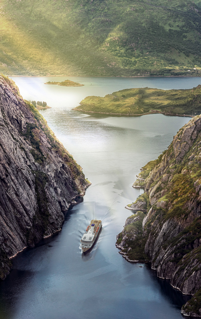 een afspiegeling is van de Noorse natuur met zee en lucht, bergen en rotsen... En gletsjers. Natuurlijke materialen en een Scandinavisch design zorgen voor een prettige sfeer aan boord zonder overdreven gedoe en dat zorgt gewoon voor een fijn en gezellig verblijf. In Noorwegen is een belangrijke rol weggelegd voor '