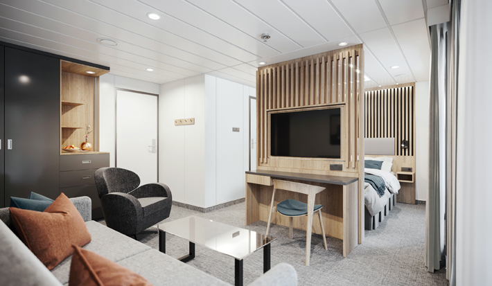 Je krijgt een ruime suite aan de voorkant van dek 7, inclusief een draaibare TV en een gezellige zitruimte met een comfortabele sofa die ook tot een bed kan worden omgevormd. Geschikt voor 4 personen, 27 vierkante meter groot.